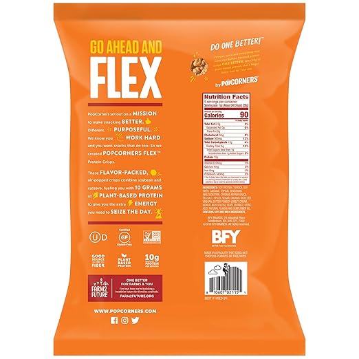 They are lower in fat and flavourful too. Each serving contains 90 calories, 10g protein, 4g fiber and 2g or less of sugar. Rated 5 out of 5 by jeannie t from delicious crispy snack these crisps are made of soy protein, but you wouldn't be able to tell when you bite into them. So we created popcorners flex protein crisps. Bfy is the maker of popcorners snacks and flex protein crisps.